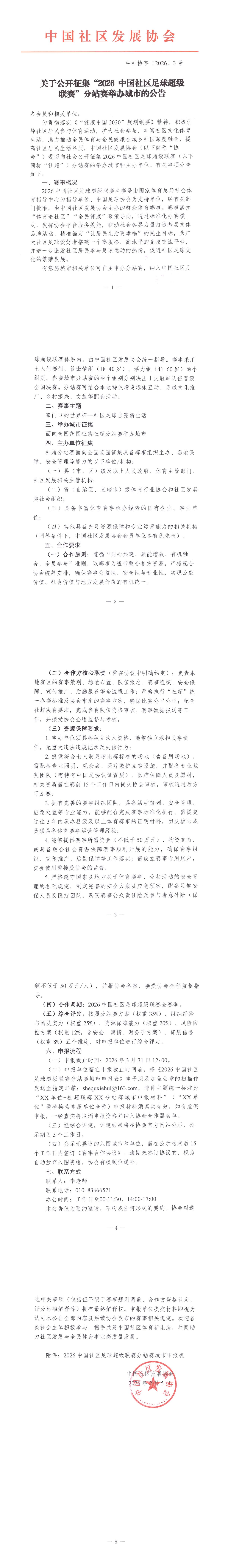 新闻中心>>协会动态 >> 关于公开征集“2026中国社区足球超级联赛”分站赛举办城市的公告